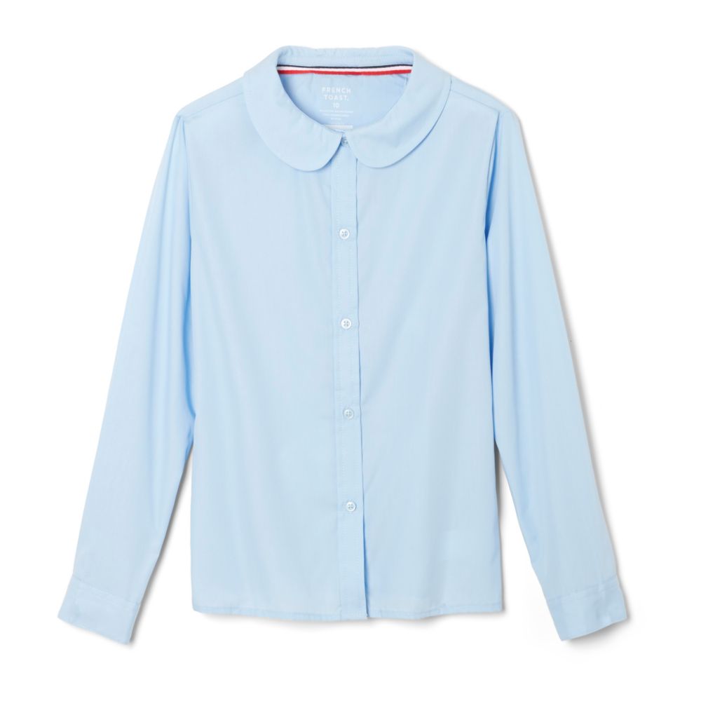 Le chemisier à manches longues et col Peter Pan moderne de French Toast est confectionné avec notre tissu en mélange de coton Wrinkle No More™, pour un entretien facile. Cet article est également doté d'un bouton nacré sur le devant et est doté de pinces au dos pour une coupe féminine. Faites de ce chemisier classique un modèle fidèle à vous-même en l'habillant de manière élégante ou décontractée pour toute activité scolaire.