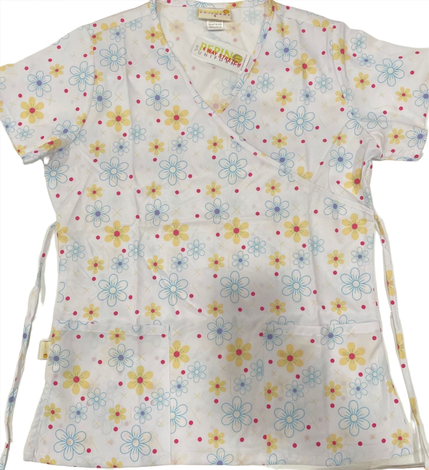 Pepino Uniforms Printed White Daisy Mock Wrap Top